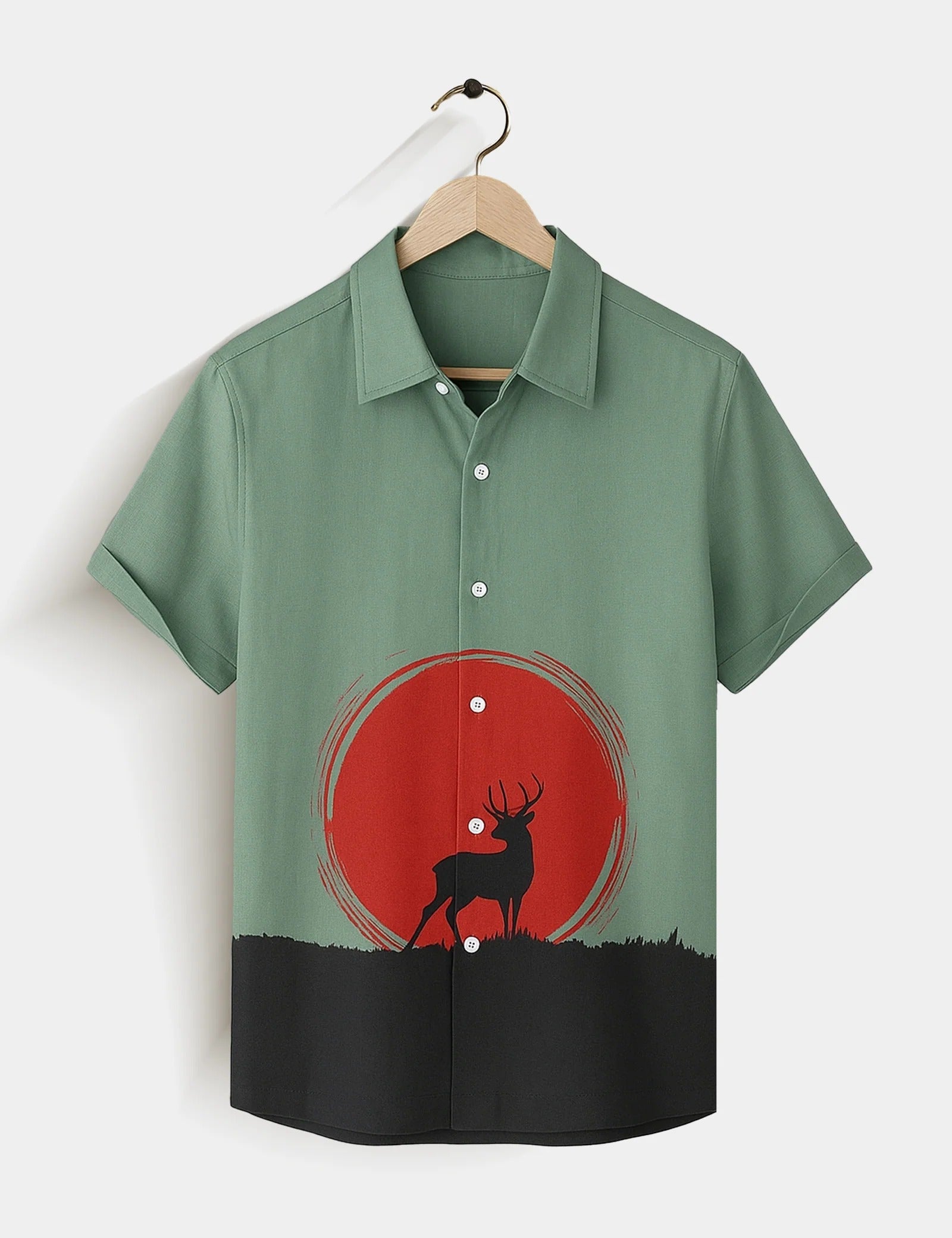 Add a bold yet calming nature touch to your wardrobe with this Men’s Deer Graphic Print Short Sleeve Shirt. Designed with a striking deer silhouette set against a vibrant red sun graphic on a soothing green base, this shirt blends artistic expression with everyday comfort.
